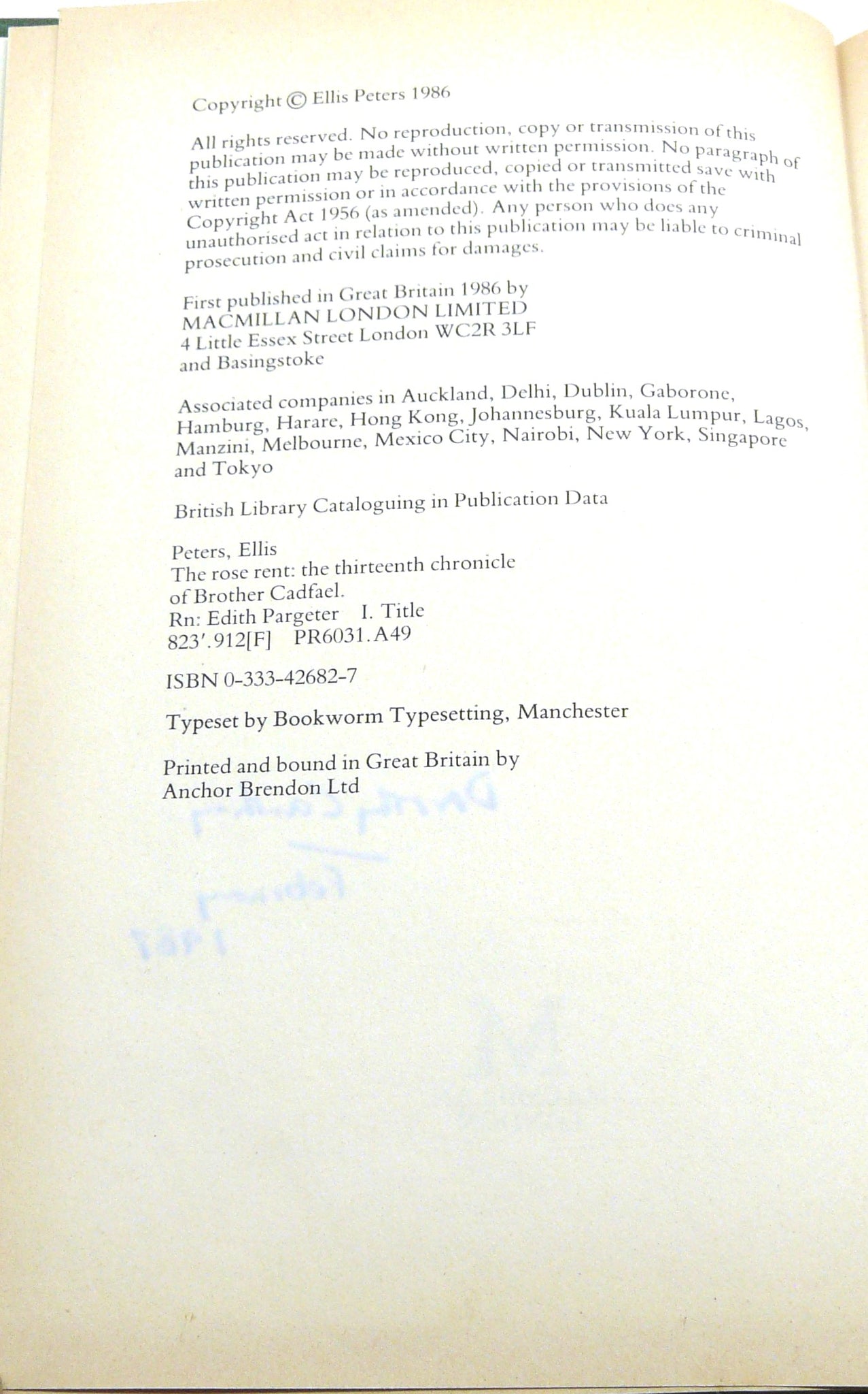 Published by Macmillan, London; 1986. 190pp. 8vo. First edition, first impression. Condition: Near Fine/Near Fine. Book 13 in the Brother Cadfael Chronicles